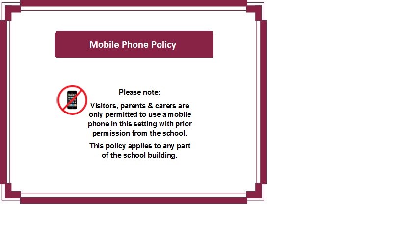 The Sign below is displayed in school. This forms part of our safeguarding policies to protect children. Please do not use mobile phones inside the school building, unless you have gained prior permission e.g. to take photos at Star of the Week assembly. You will be asked to put mobiles away if you are seen.